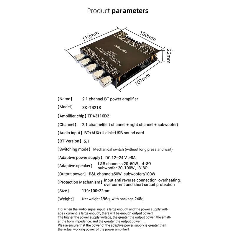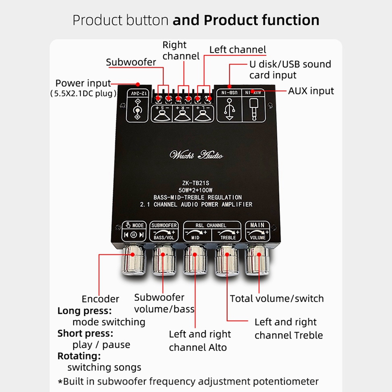 ZK-TB21S Bluetooth 5.1 Stereo Audio Receiver Amplifier Board 2.1Channel Amp Module for Speakers TPA3116D2 50Wx2+100W