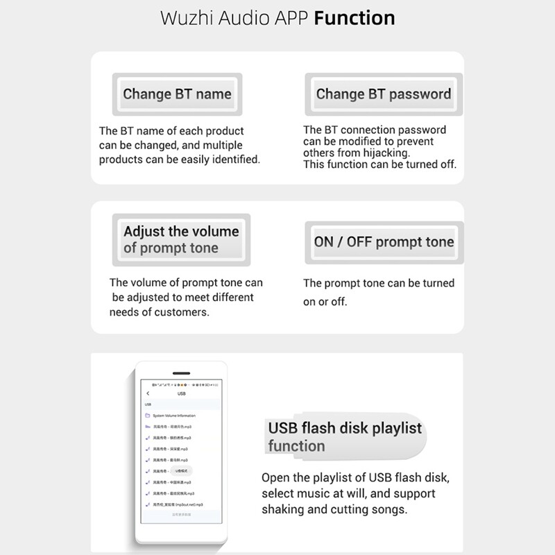 4. Compared with TB21, the APP function is added. The APP supports changing the bluetooth name, password, prompt tone size, prompt tone switch, sleep aid song, mode switching, sound effect selection, U disk list, etc.