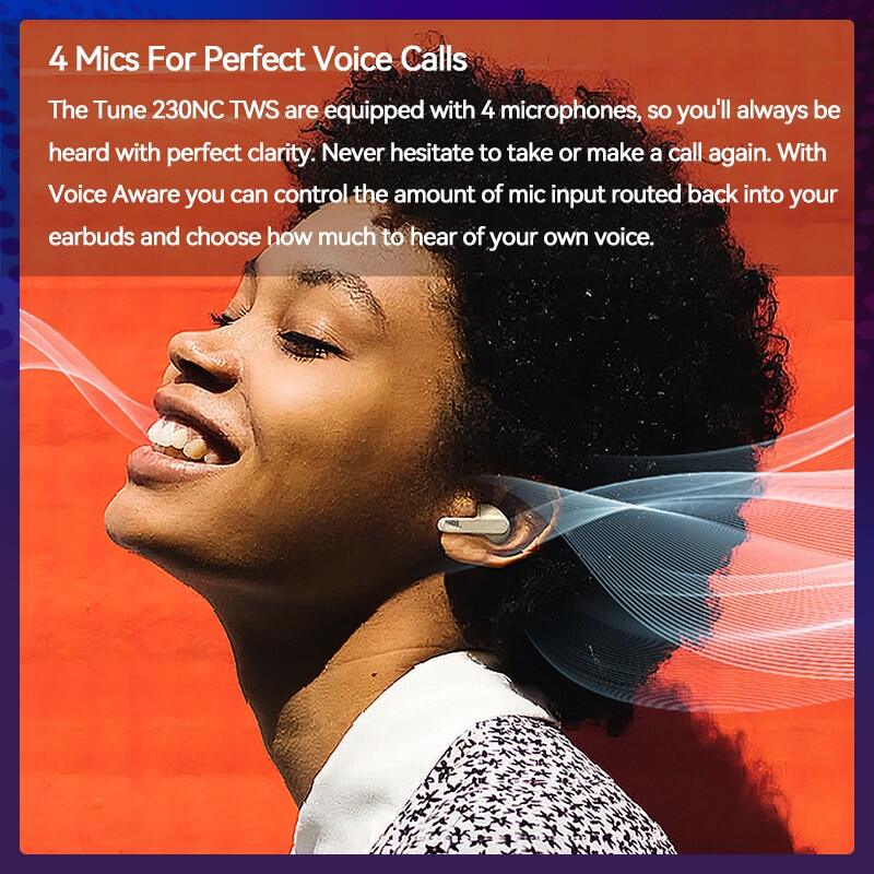 Enjoy hassle-free, hands-free calls in stereo. The Tune 230NC TWS are equipped with 4 microphones, so you'll always be heard with perfect clarity. Never hesitate to take or make a call again. With Voice Aware you can control the amount of mic input routed back into your earbuds and choose how much to hear of your own voice.