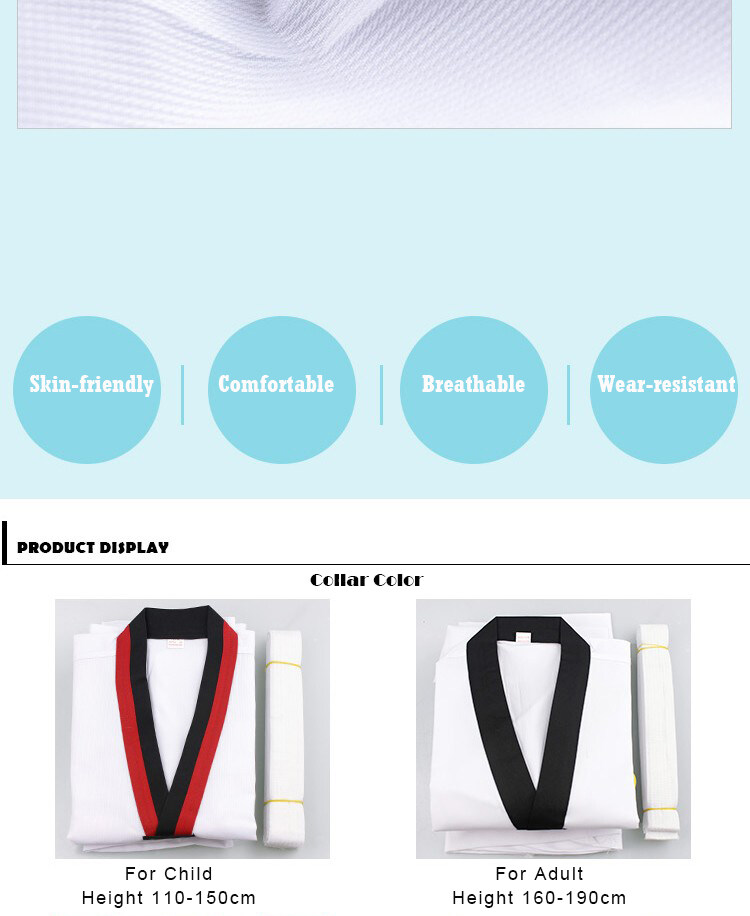【Application】 Suitable to wear for Taekwondo, Karate, martial arts actions, including but not limited to kicking, blocking and punching, without any inconvenience.