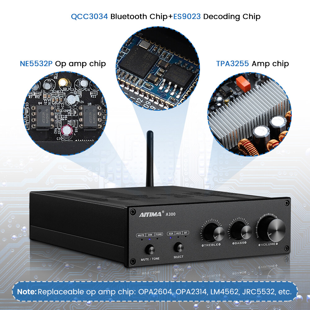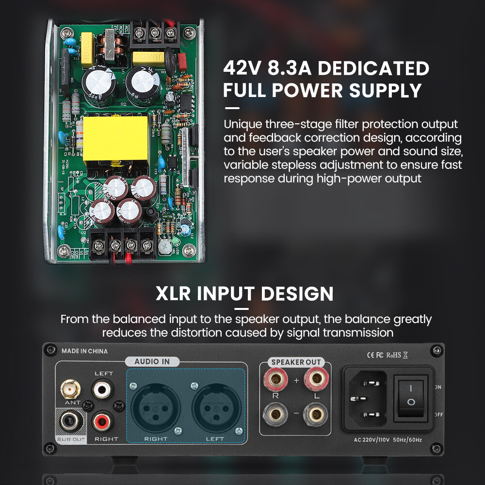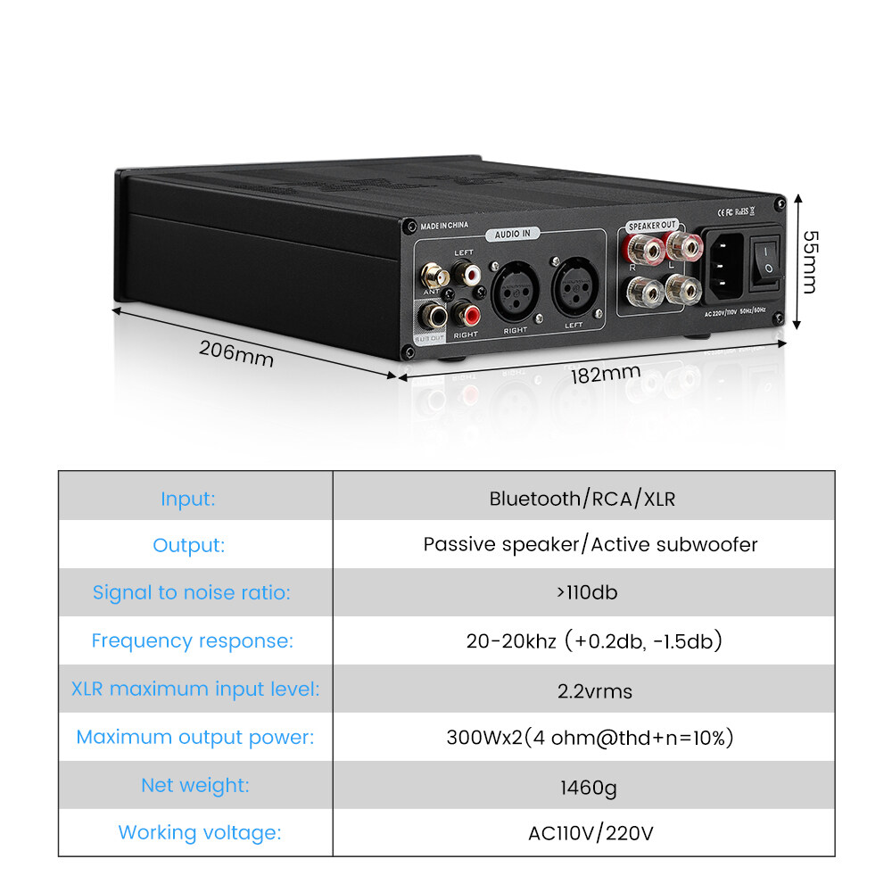 Chipset: TPA3255+QCC3034+ES9023+NE5532 NE5532 can replace the op amp chip: OPA2604, OPA2314, LM4562, JRC5532, etc. QCC3034 Bluetooth: Version 5.0, supports AAC, SBC, APTX, APTX-LL, APTX-HD Input channel: AUX (unbalance), XLR (balance), bluetooth Input Sensitivity: 1Vrms XLR maximum input level: 2.2vrms Signal-to-noise ratio: >110db Total Harmonic Distortion: 0.02% Speaker impedance: 4-8 ohms Output power: 300W*2 4 ohms@thd+n=10% Frequency response: 20-20khz (+0.2db, -1.5db) Working voltage: 110v/220v Product size: 182*55*206 WxH*D without protrusions