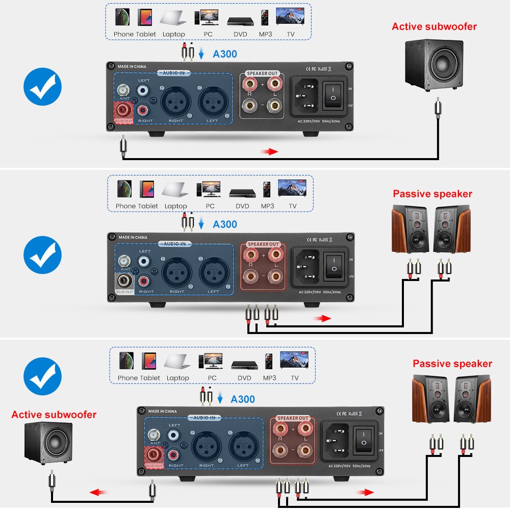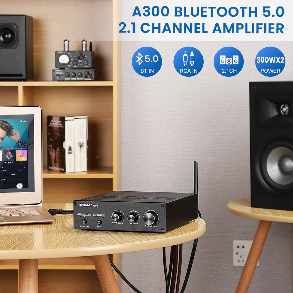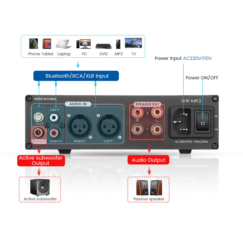 With stereo RCA and wireless Bluetooth input, supporting iPod, Phone, MP3 players, TV, MP3, CD players, laptop, desktop computer or other devices input. Adopting QCC3034 Bluetooth chip that has strong compatibility with much Bluetooth devices to achieve lossless transmission. Super large output power that can reach 300W +300W, easily to drive large passive speakers, matched very well with outdoor/ bookshelf/ computer/ desktop /ceiling /floor standing speakers. With tone control, treble and bass can be adjusted independently to provide much delicate sound that suits different listening style,adding much fun and higher playability. High quality components are used to ensure HiFi sound and long time stable work: Built-in large power high-efficiency switching power supply, AC 100-240V working voltage for global use. High-precision chip resistors for better signal-to-noise ratio. Special inductance for audio to ensure clear and powerful sound. Pure aluminum chassis and fine process, with good heat dissipation.