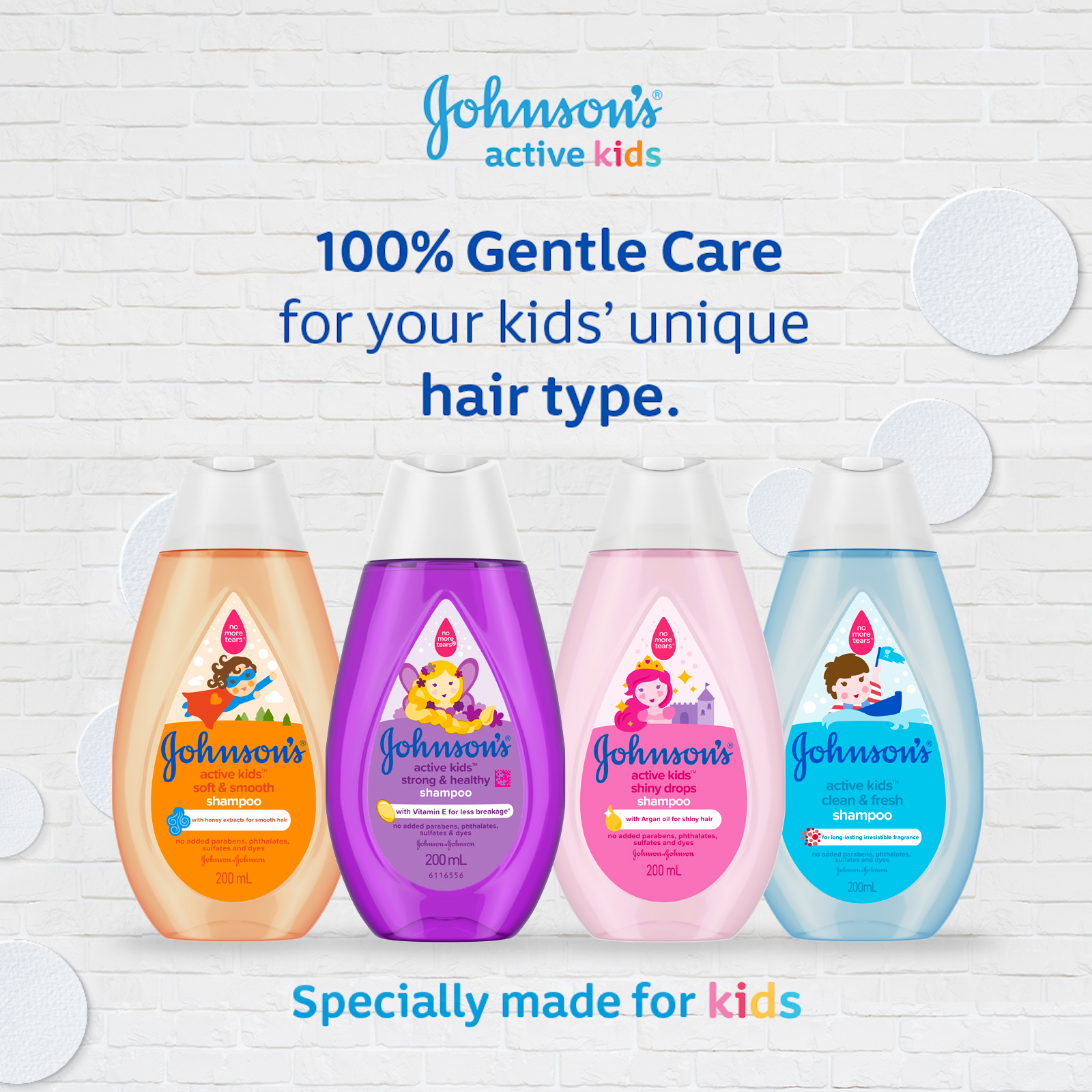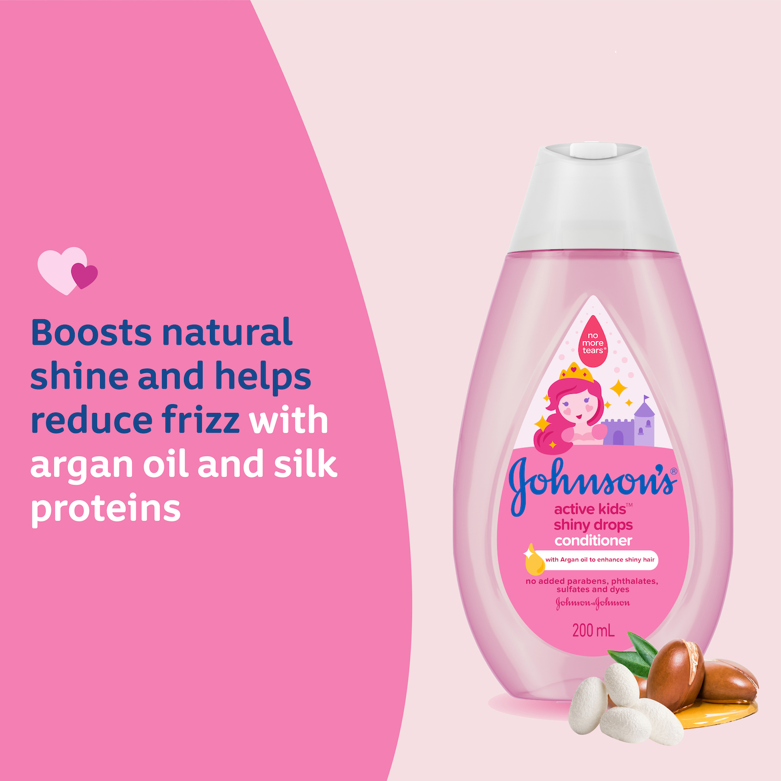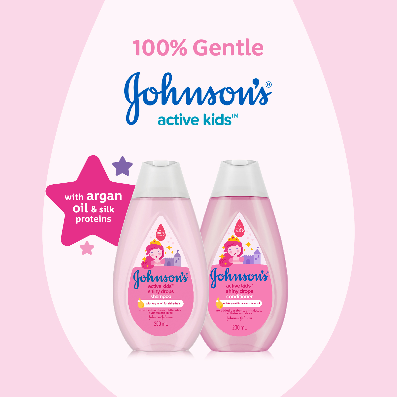 Johnson's® Active Kids™ Shiny Drops conditioner boost natural shine with Argan oil & silk proteins for shiny & silky hair. As baby starts to walk & play, their needs change. Our Active Kids™ range is specially designed to be gentle versus adult products, but effective for toddler needs.