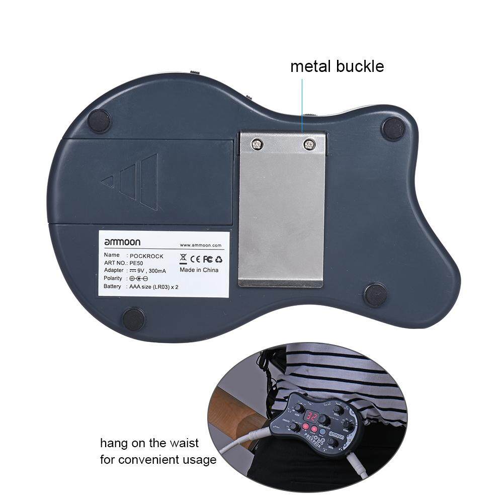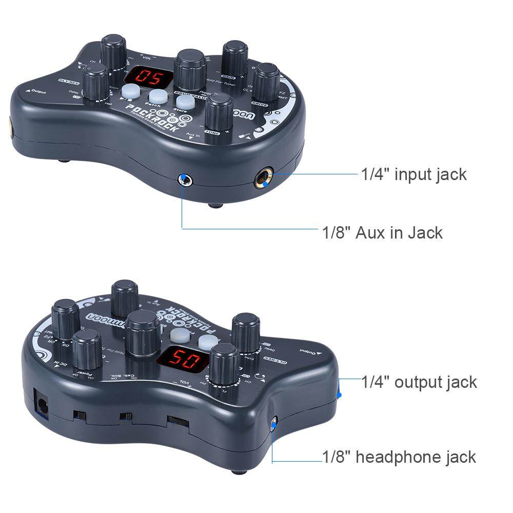 ammoon PockRock is a portable guitar multi-effects pedal. 5 effect modules with 15 effect types, 40 drum rhythms, 16 preset patches and 16 user patches. It is not only a sound library, but also allows you to create your own sound library.  With headphone out and AUX in, you can enjoy your playing at night and no need to worry about disturbing others.  Battery-powered mode allows you to take it to everywhere. Everything you need is in PockRock!