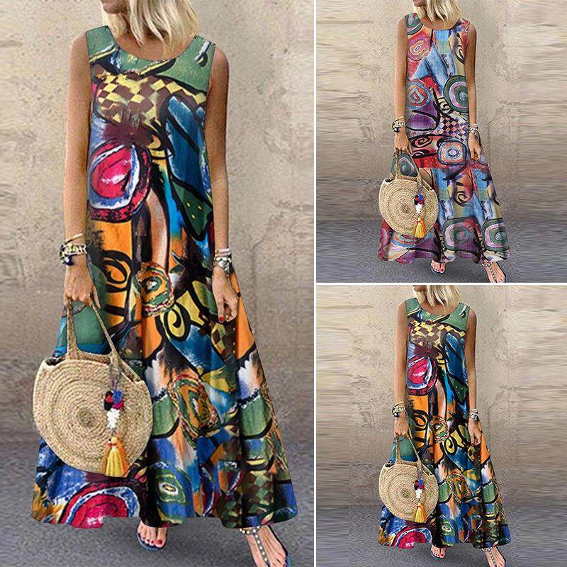 ZANZEA Women Summer Sleeveless Sundress Kaftan Vintage Retro Printed Maxi Dress