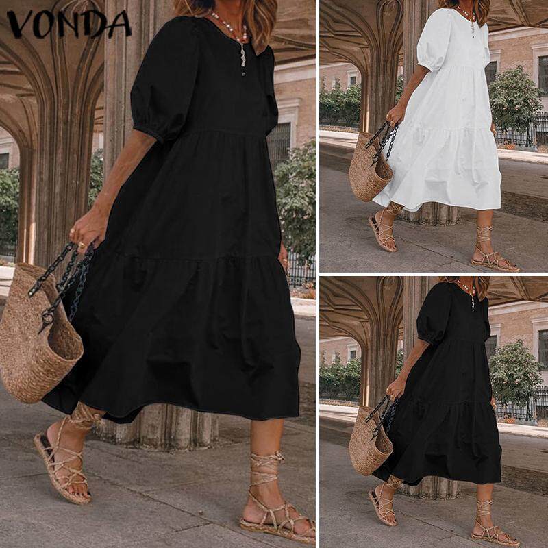 (Korean Causal) VONDA Womens Puff Sleeve Shirt Dress Holiday Casual Sundress Retro Solid Long Tops