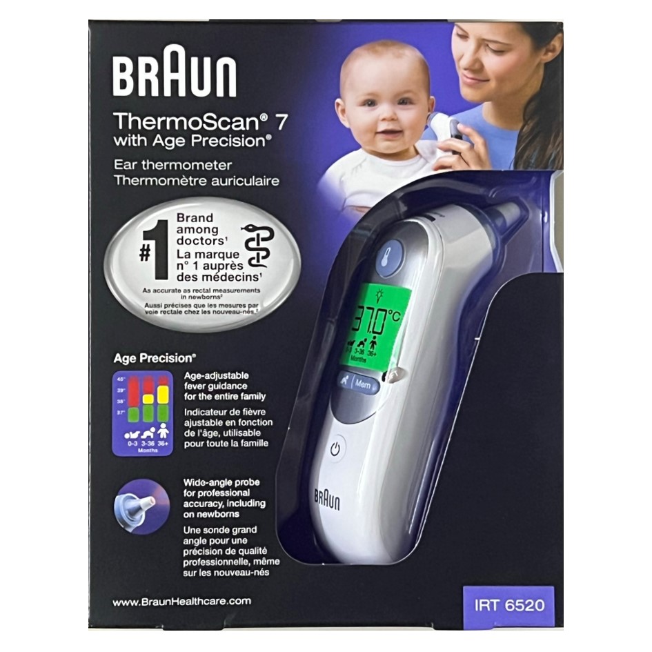 Braun Thermoscan 7 Ear Thermometer IRT6520 with patented age precision technology. simply select your childs age, take their temperature and the colour coded display will help you understand the temperature reading, based on the age of the child, and act accordingly.by selecting braun thermoscan 7, you are choosing the no.1 thermometer brand among doctors. the tip on other thermometers can cool the area where the reading is taken, which can lead to inaccurate readings. the tip on the thermoscan is warmed before use, to ensure professional accuracy. plus, the exactemp guidance system confirms the correct position and accurate reading with a light and a beep.