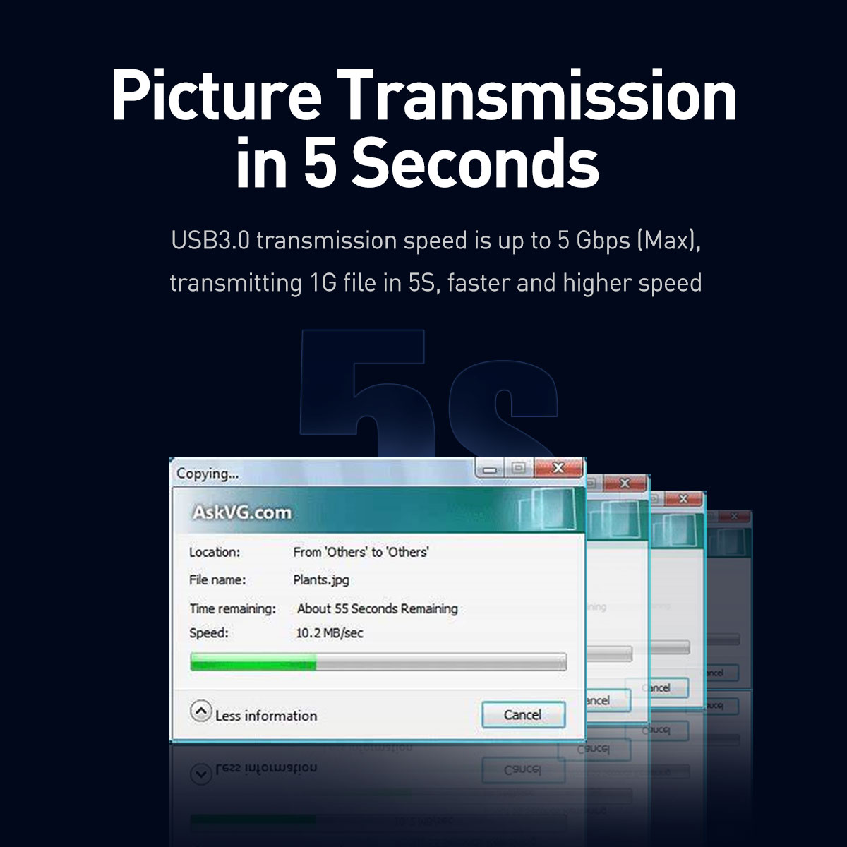 - USB 3.0 transmission speed up to 5 Gbps(Max), transmitting 1G file in 5 seconds