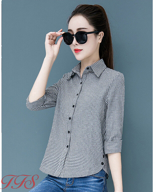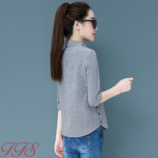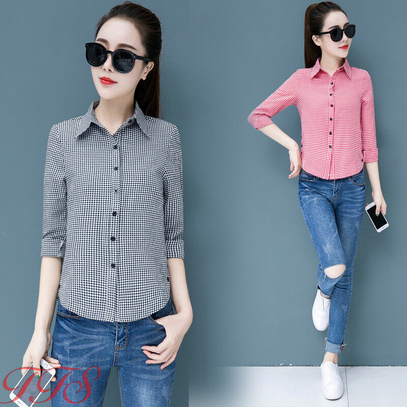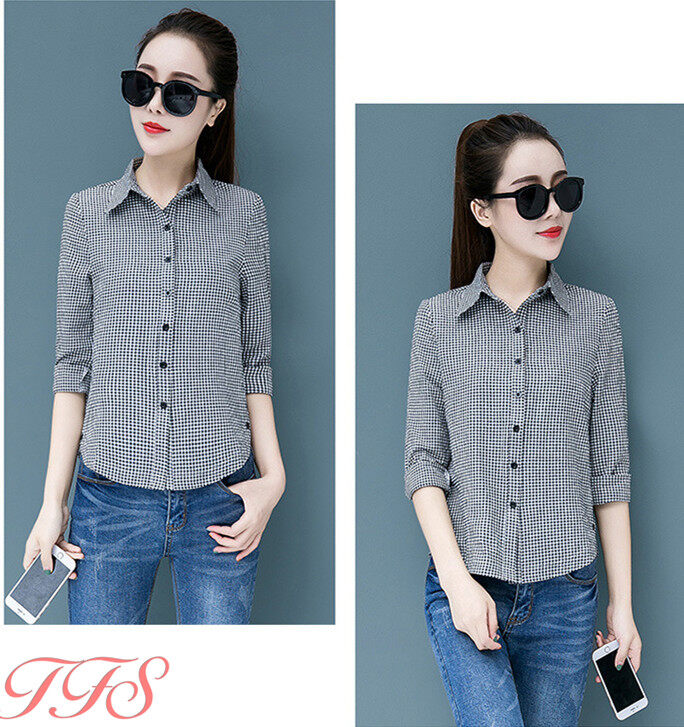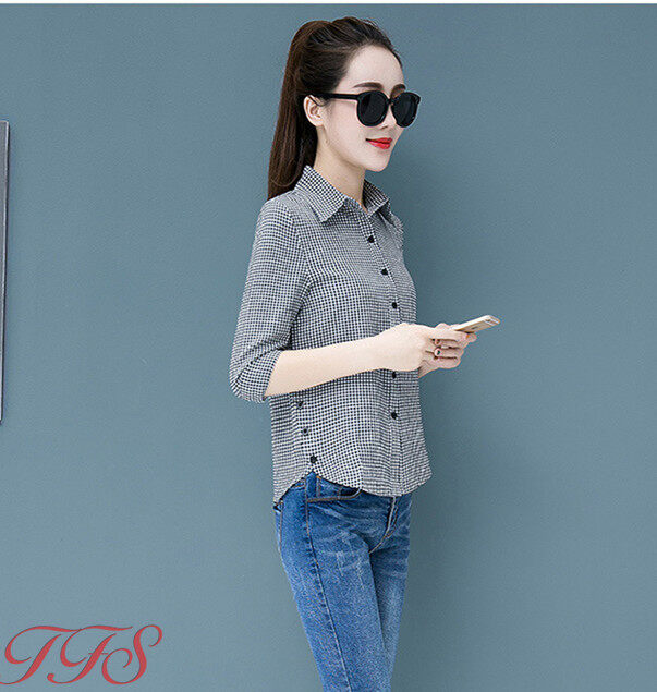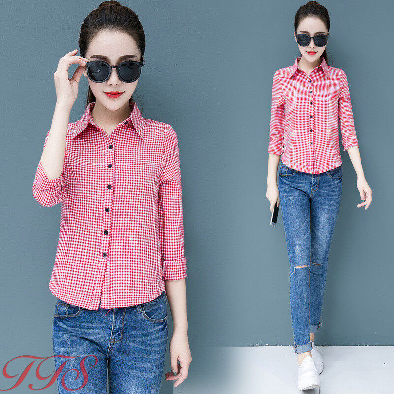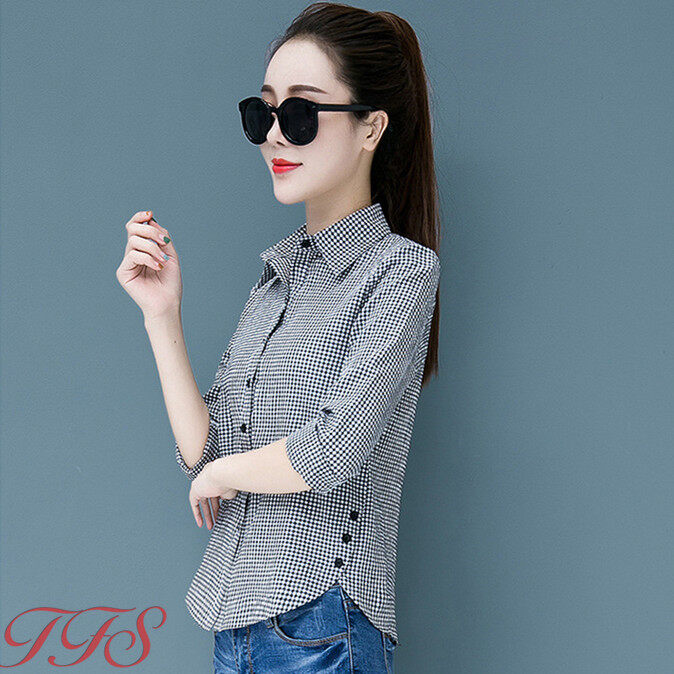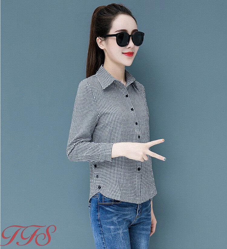 TFS Women Classic Plaid Shirt Long Sleeve Casual Joker Slim Korean Blouse