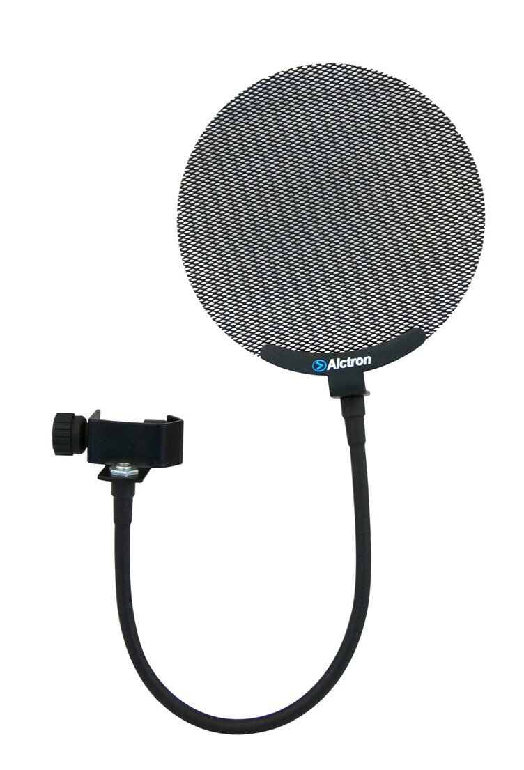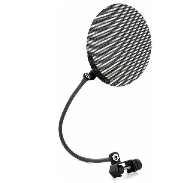 New metal screen mini pop filter, equipped with adjustable gooseneck and universal mounting plate for straight microphone stands.