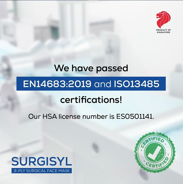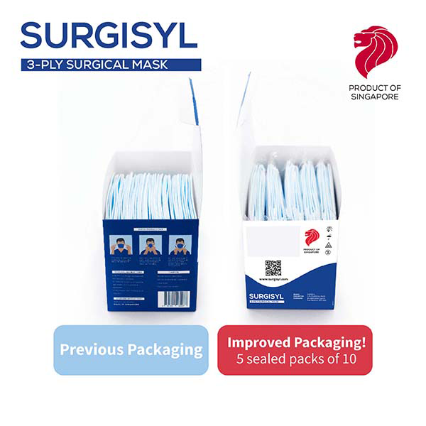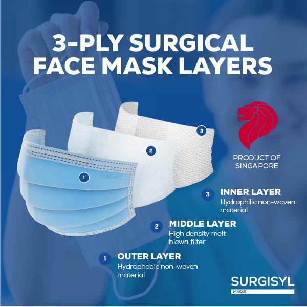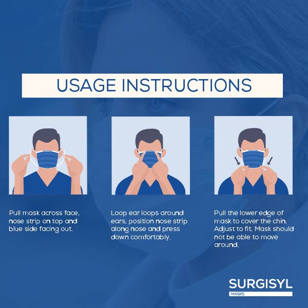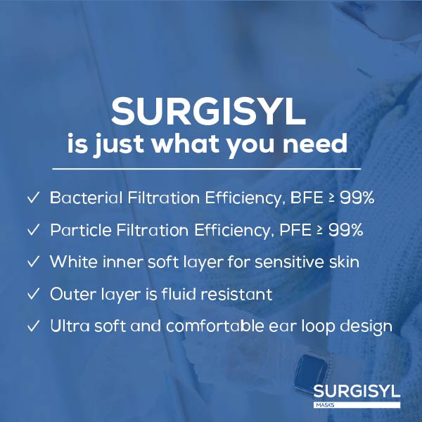 SURGISYL 3-Ply Disposable Face Masks have a Bacterial Filtration Efficiency (BFE) of 99%. Designed with comfortable ear loops and a form-fitting design, it is also breathable and hypoallergenic.