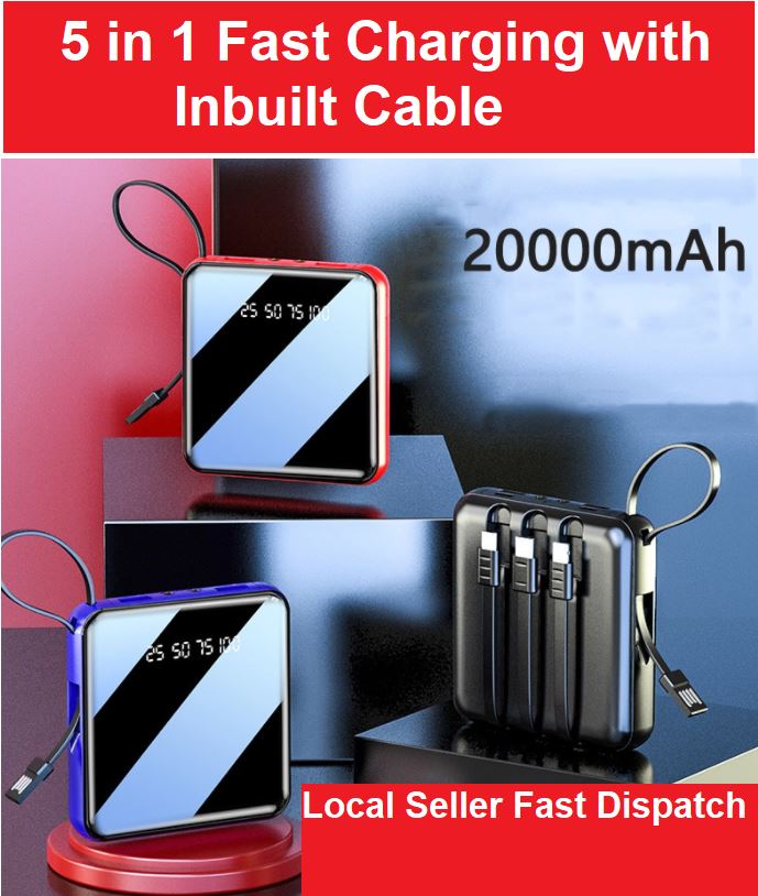 2 INPUT: 1 Micro USB, 1Type C5 OUTPUT: 3 cables: lightning, type c and micro USB and 2 USB