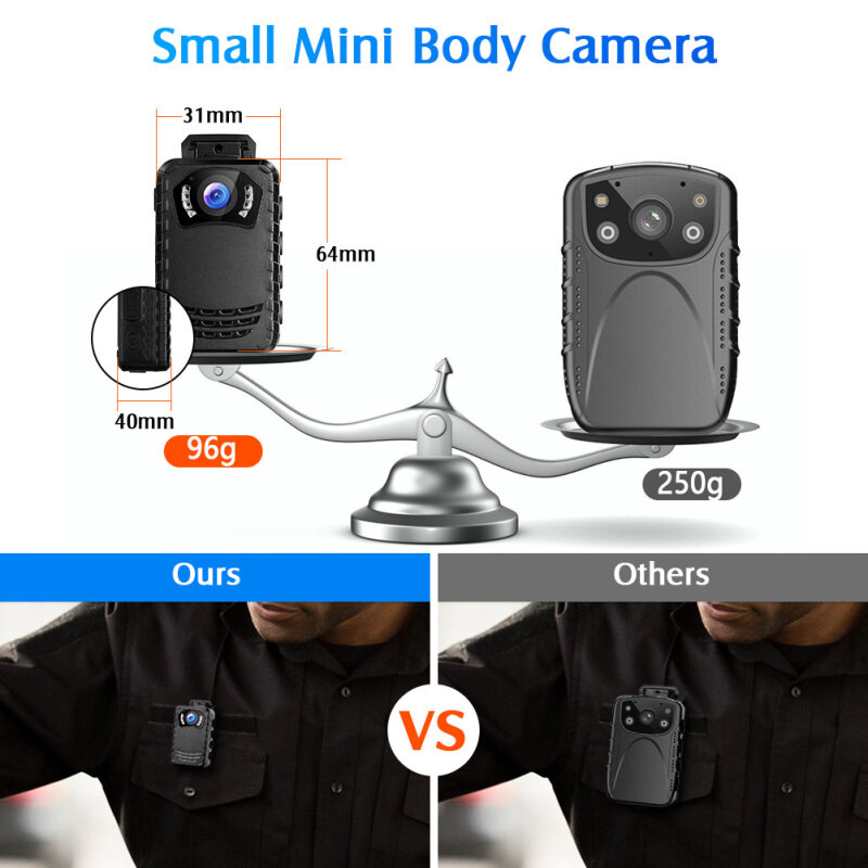 【Smallest Body Camera, Compact and Portable】★N9 Body mounted camera features compact size and lightweight, 80g only and 68mm×43mm×34mm dimensions. Although it is a smallest body camera in all body camera models, but still has complete features and functions. Support Edit Police ID ,File Protection Function ,Stealth Mode, Playback video, Delete Files from the camera directly, Motion Detection ect.