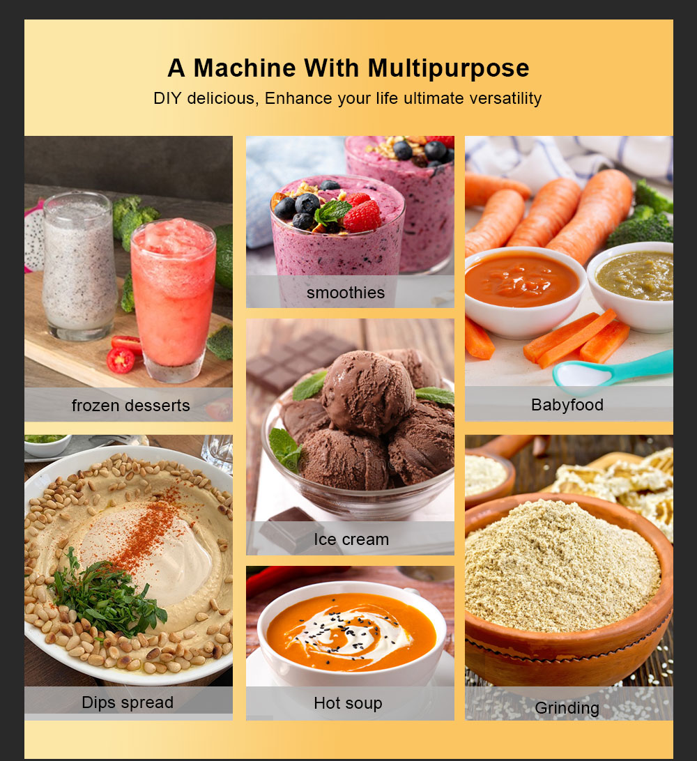 : The peak 2200W (rated 1500W) commercial-grade motor with hardened 6 stainless steel can easily break ice cubes and frozen fruits, it makes the large ice cube to small slush. Benefit from the WHOLE food by thoroughly pulverizing the ice cubes, frozen fruits, vegetables, seeds, nuts and much more.Variable Speed Control & Pulse Feature